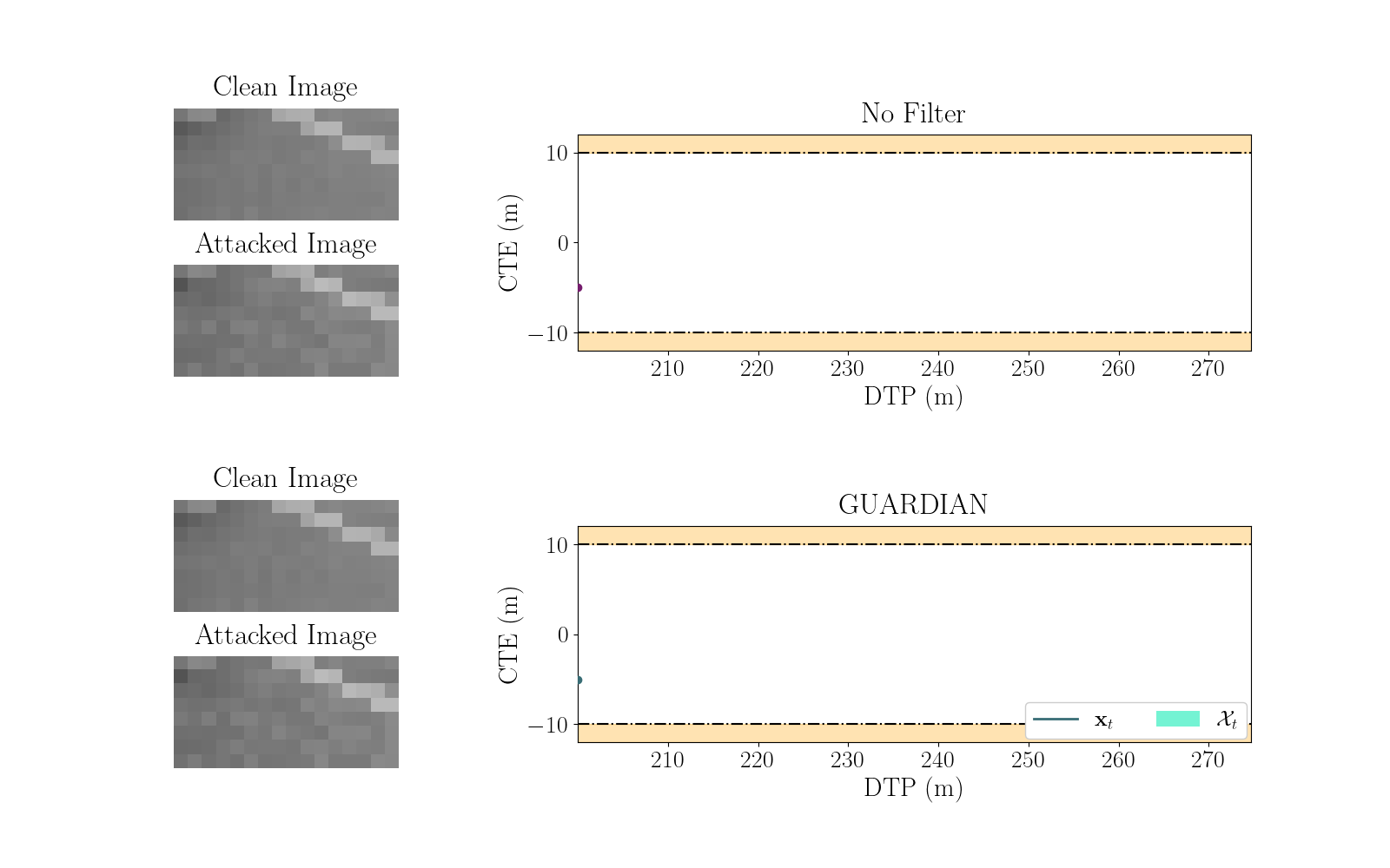 Safety filtering is an effective method for enforcing constraints in safety-critical systems, but existing methods typically assume perfect state information. This limitation is especially problematic for systems that rely on neural network (NN)-based state estimators, which can be highly sensitive to noise and adversarial input perturbations. We address these problems by introducing GUARDIAN: Guaranteed Uncertainty-Aware Reachability Defense against Adversarial INterference, a safety filtering framework that provides formal safety guarantees for systems with NN-based state estimators. At runtime, GUARDIAN uses neural network verification tools to provide guaranteed bounds on the system’s state estimate given possible perturbations to its observation. It then uses a modified Hamilton-Jacobi reachability formulation to construct a safety filter that adjusts the nominal control input based on the verified state bounds and safety constraints. The result is an uncertainty-aware filter that ensures safety despite the system’s reliance on an NN estimator with noisy, possibly adversarial, input observations. Theoretical analysis and numerical experiments demonstrate that GUARDIAN effectively defends systems against adversarial attacks that would otherwise lead to a violation of safety constraints.